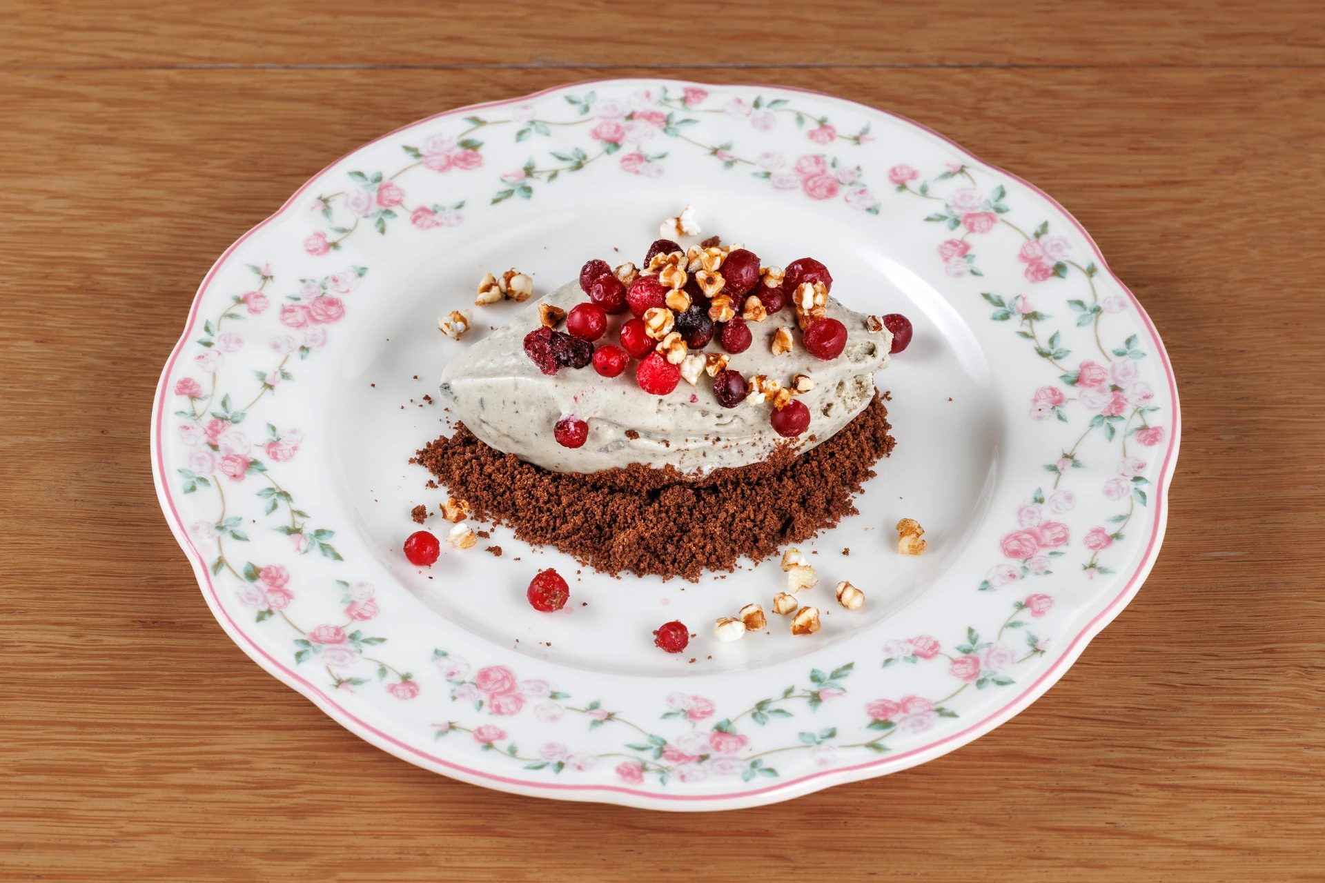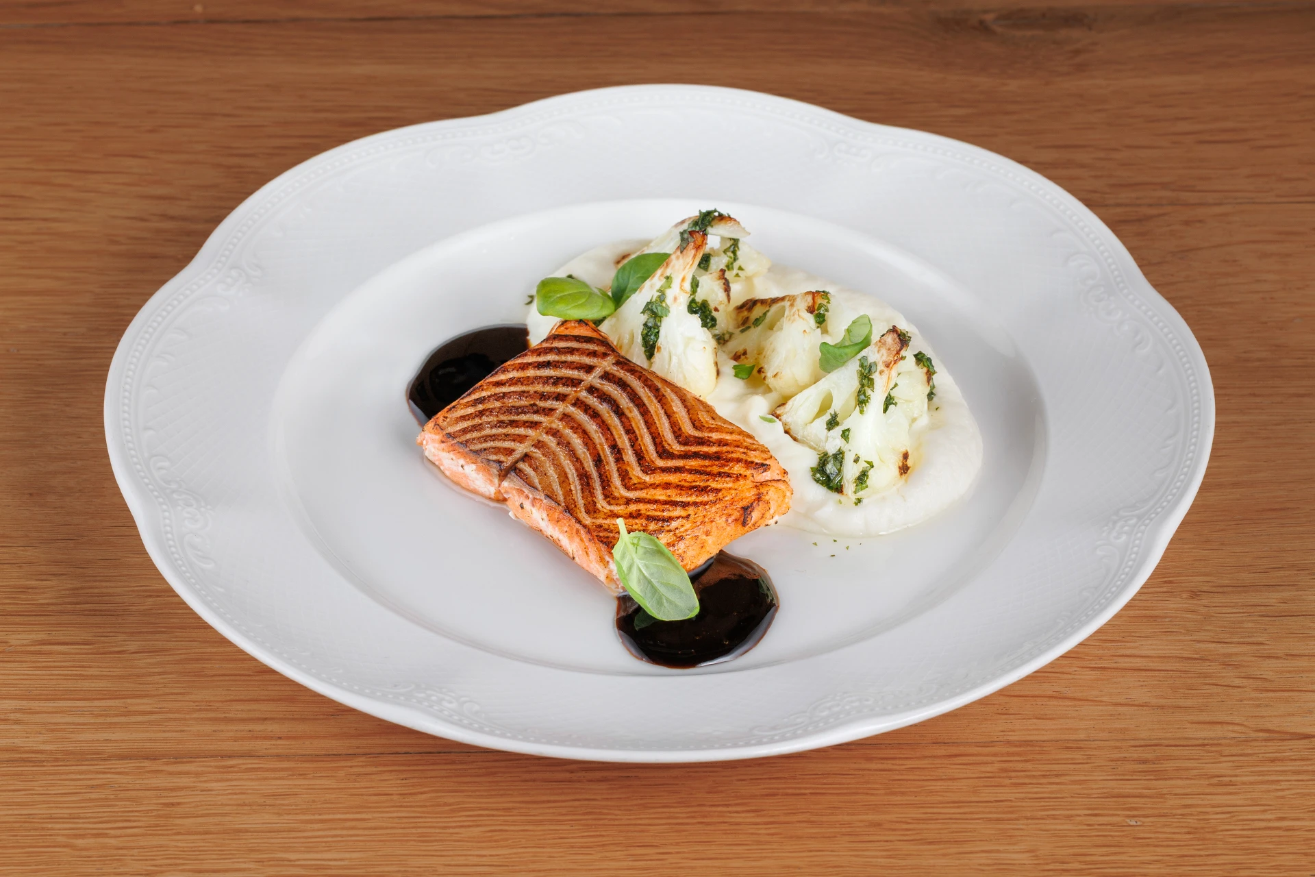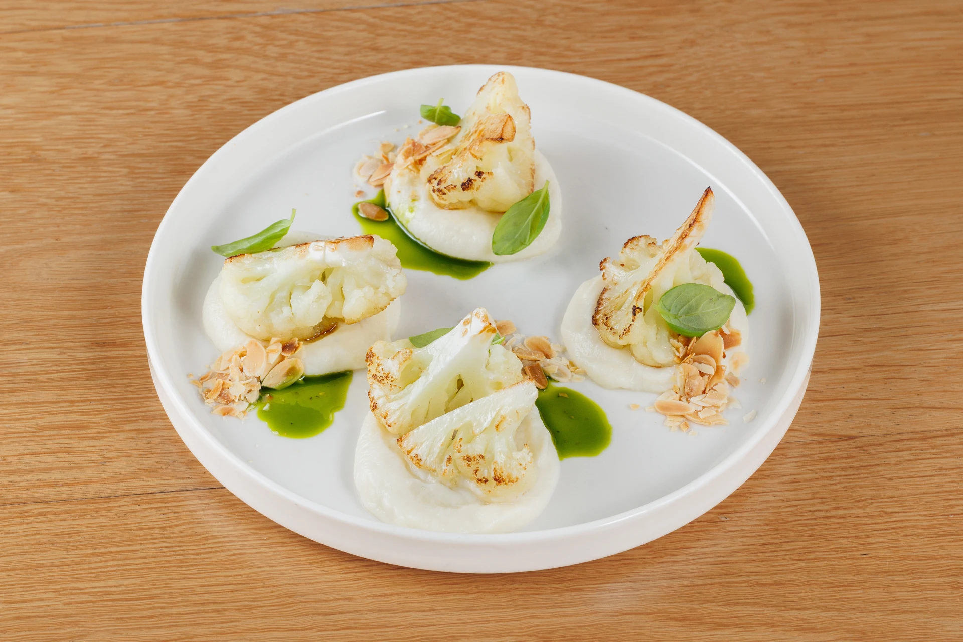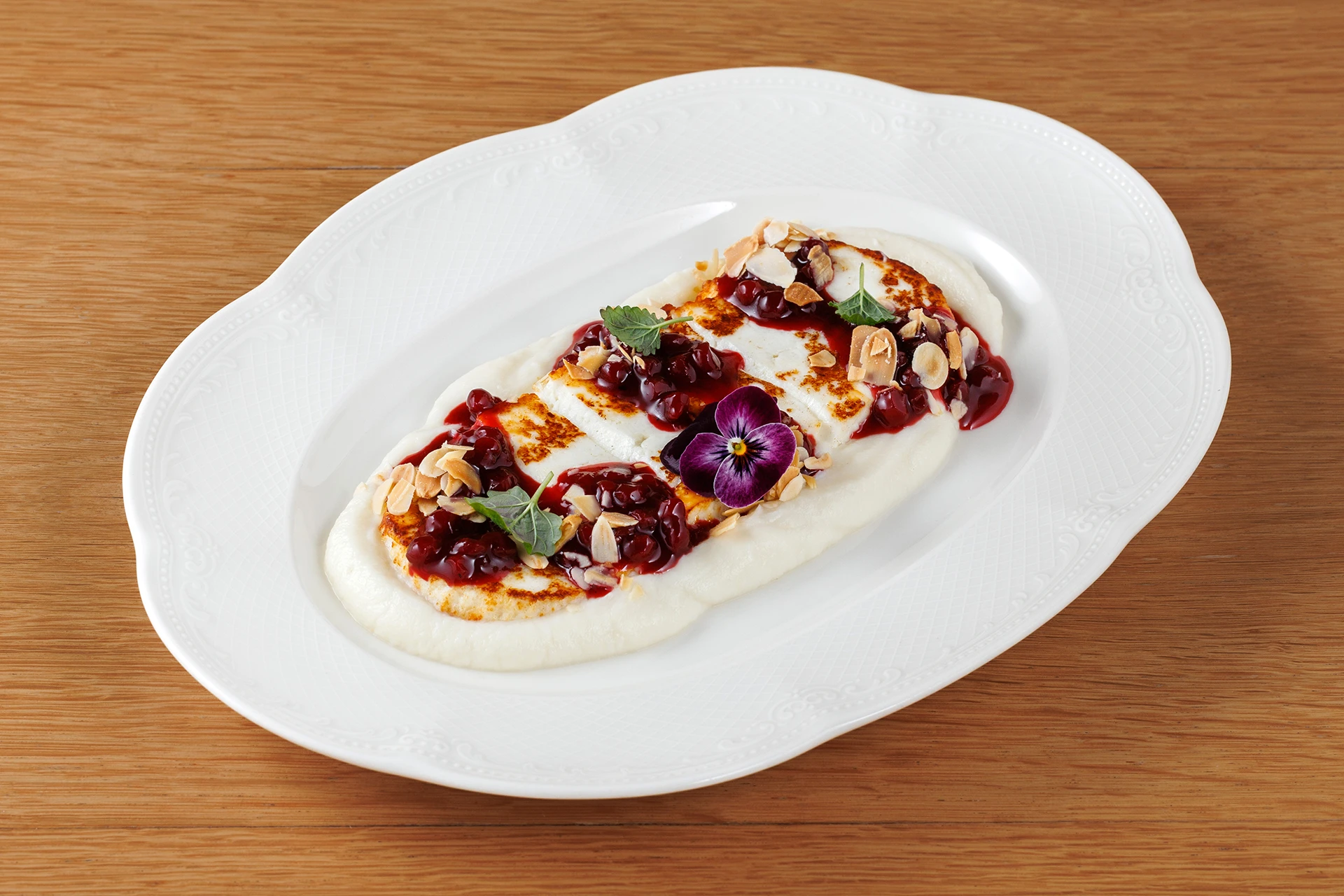 Жареный адыгейский сыр с кремом из цветной капусты и кофейно-брусничным соусом
