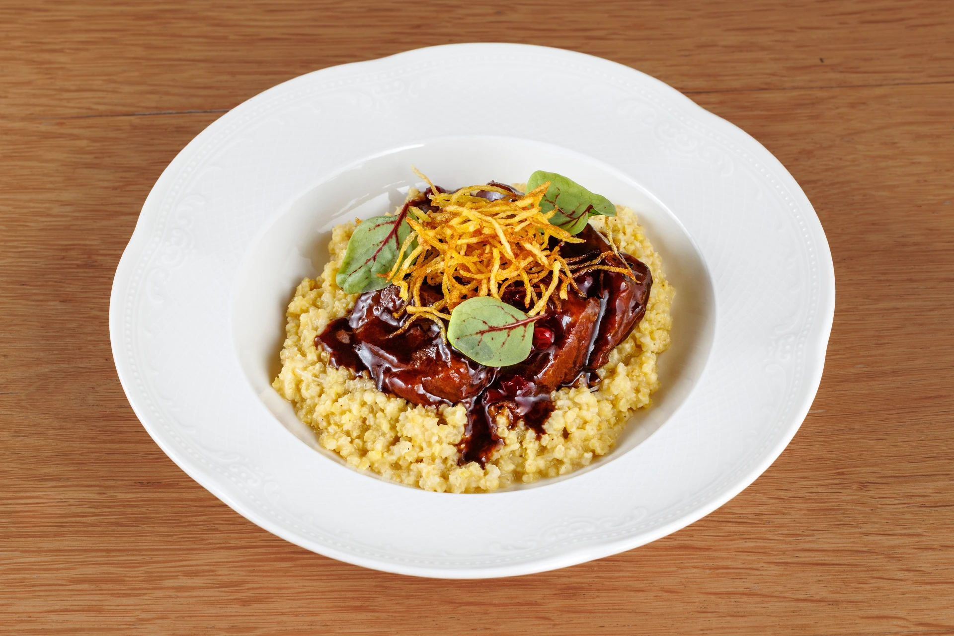 Говяжьи щечки с пшеном и кофейно-брусничным соусом