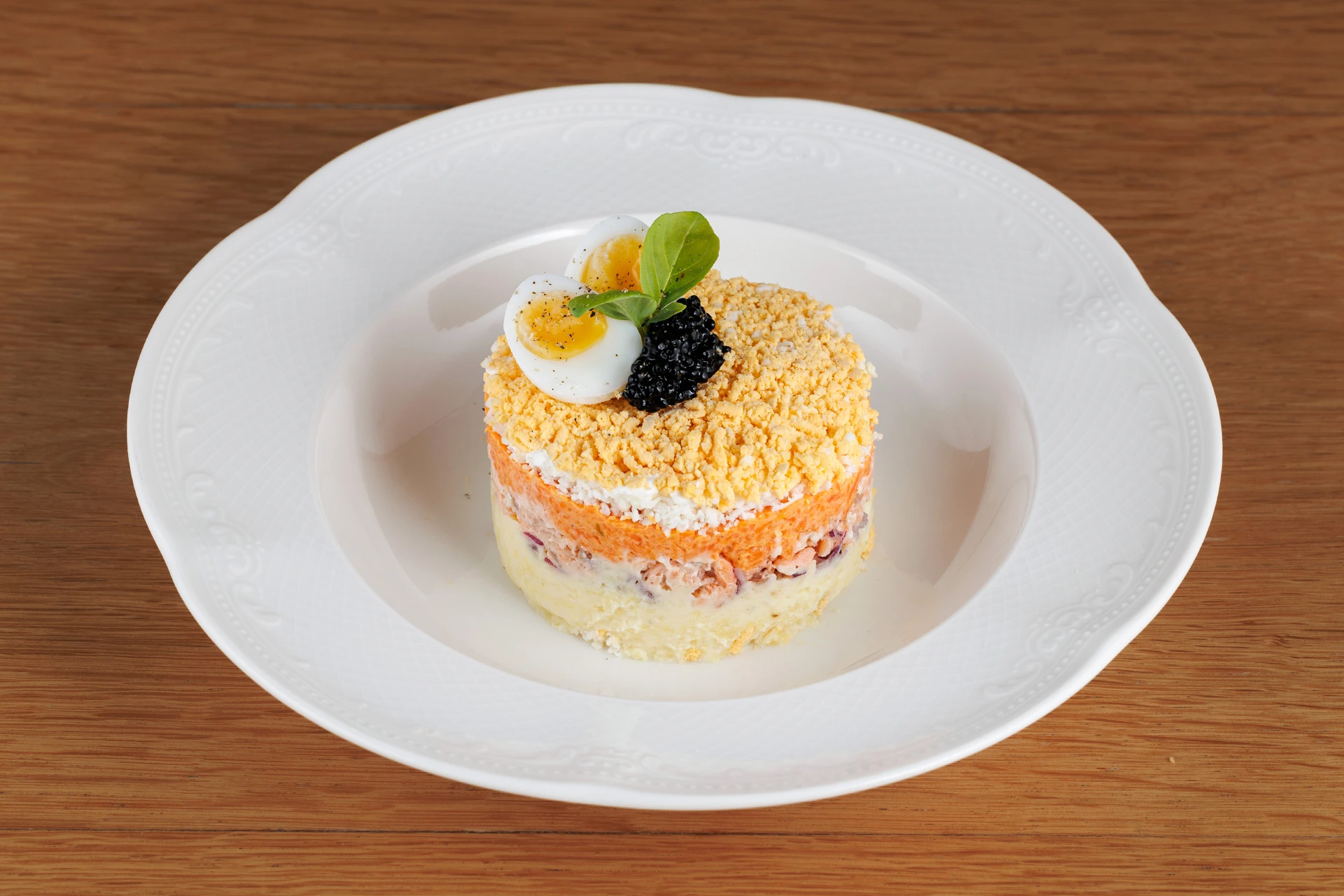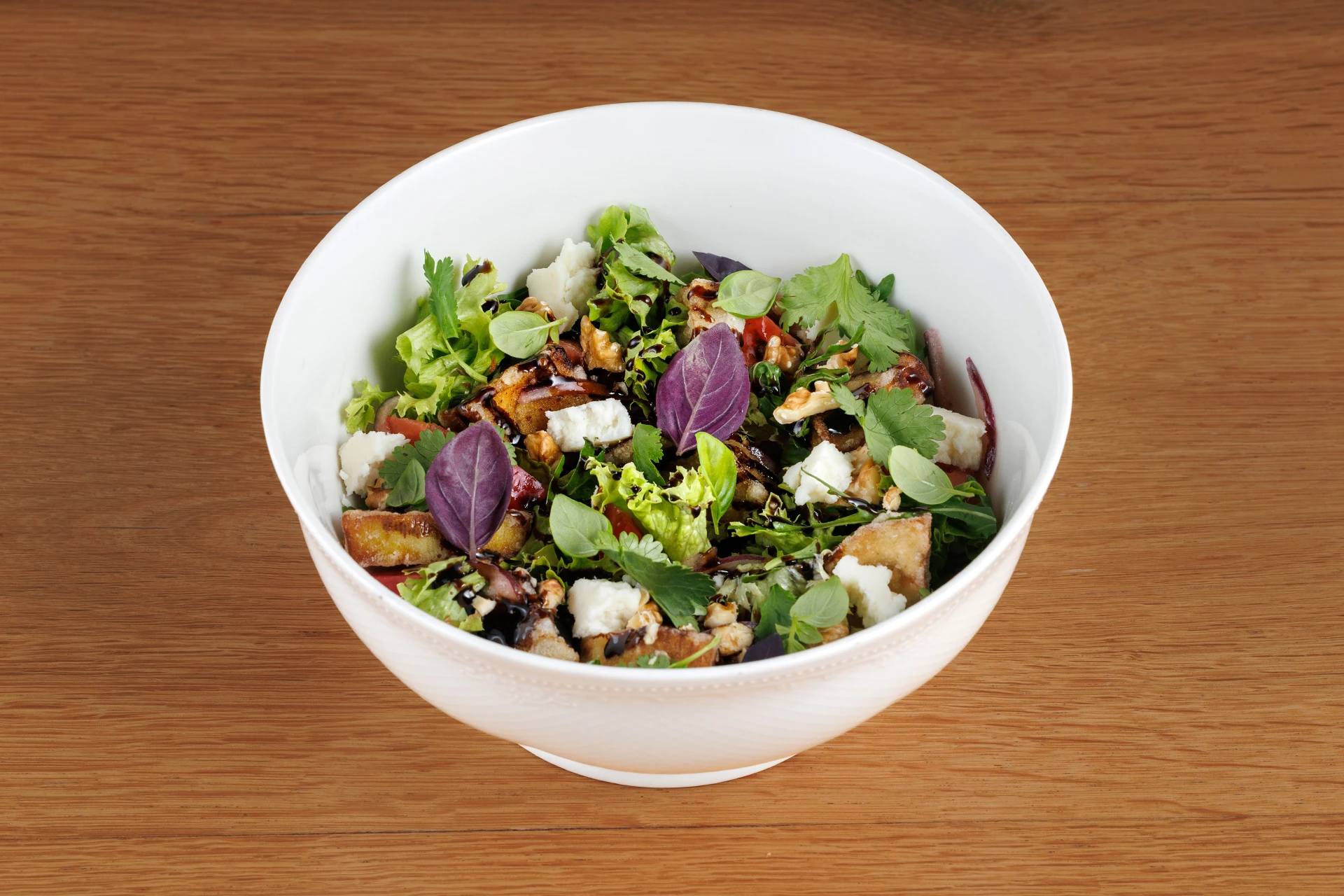 Салат с жареными баклажанами, томатами и соусом из кваса