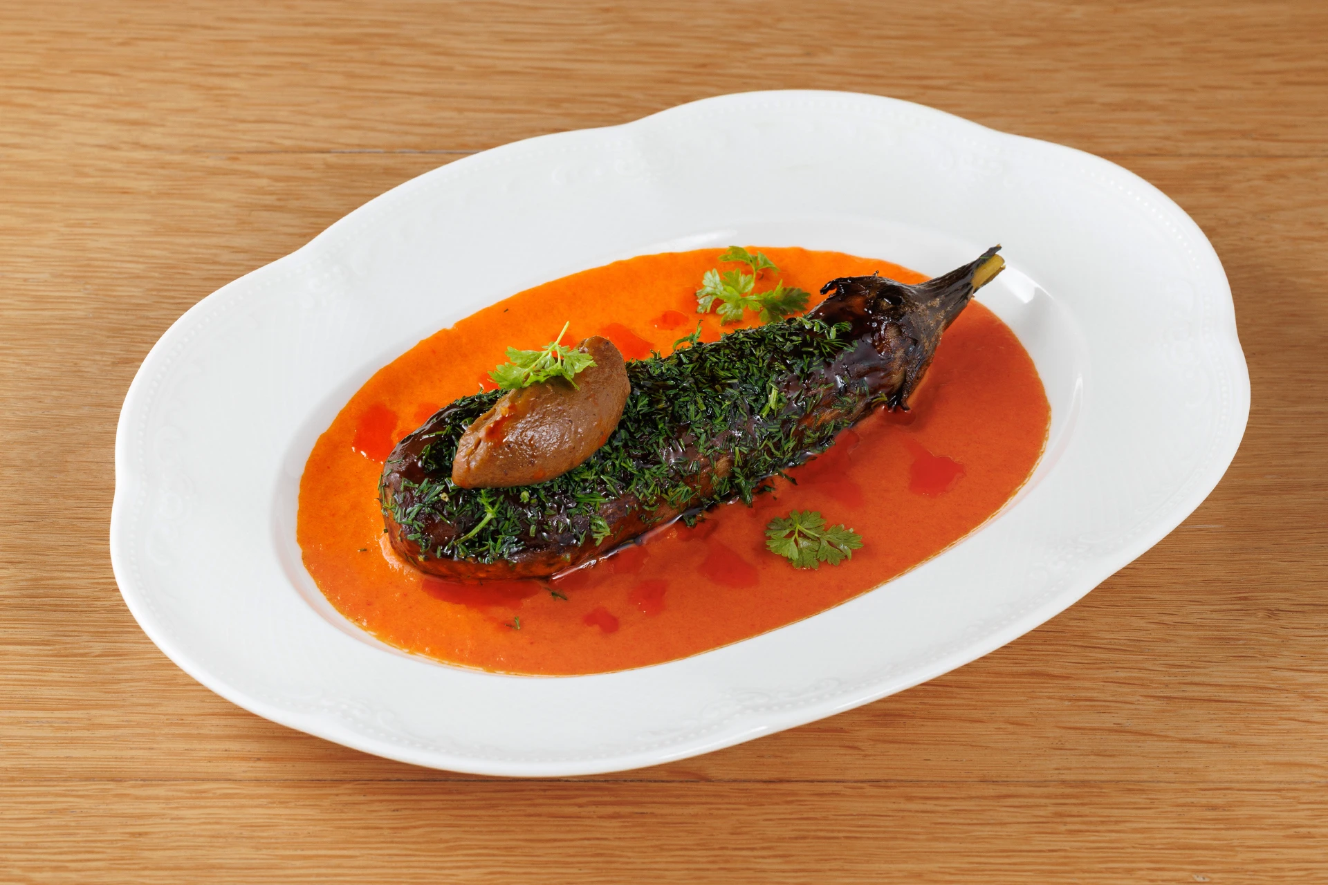 Печеный баклажан с соусом из перца и кремом из чеснока