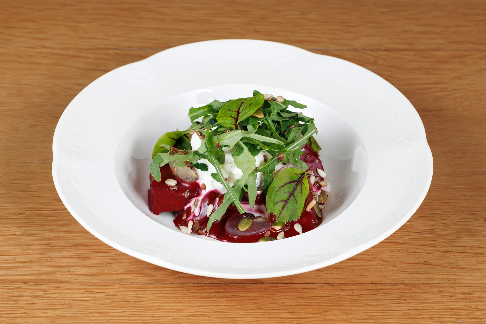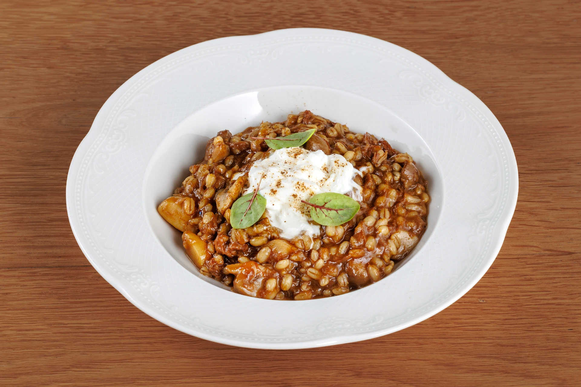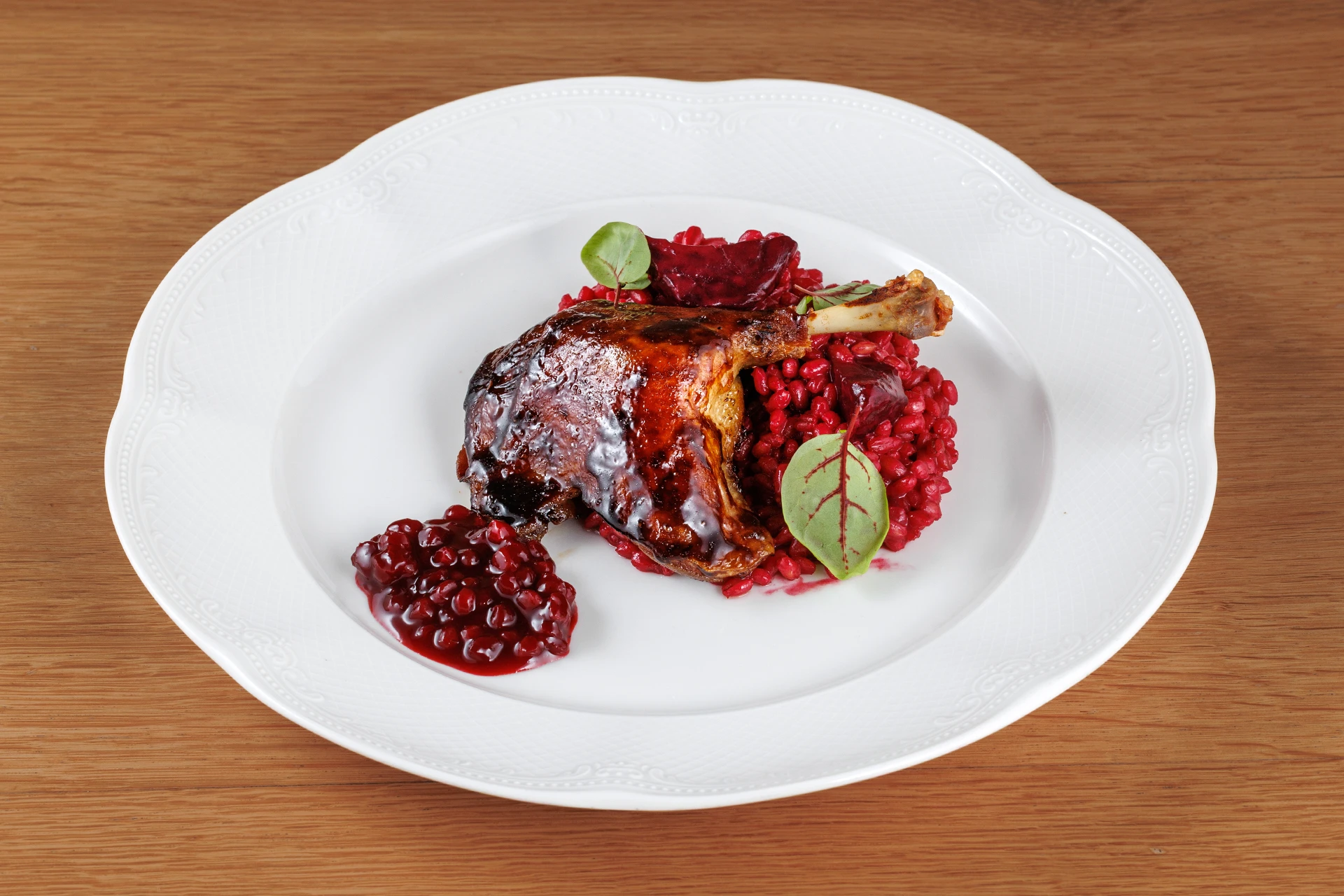 Утиная ножка с вяленой свеклой, перловкой и кофейно-брусничным соусом