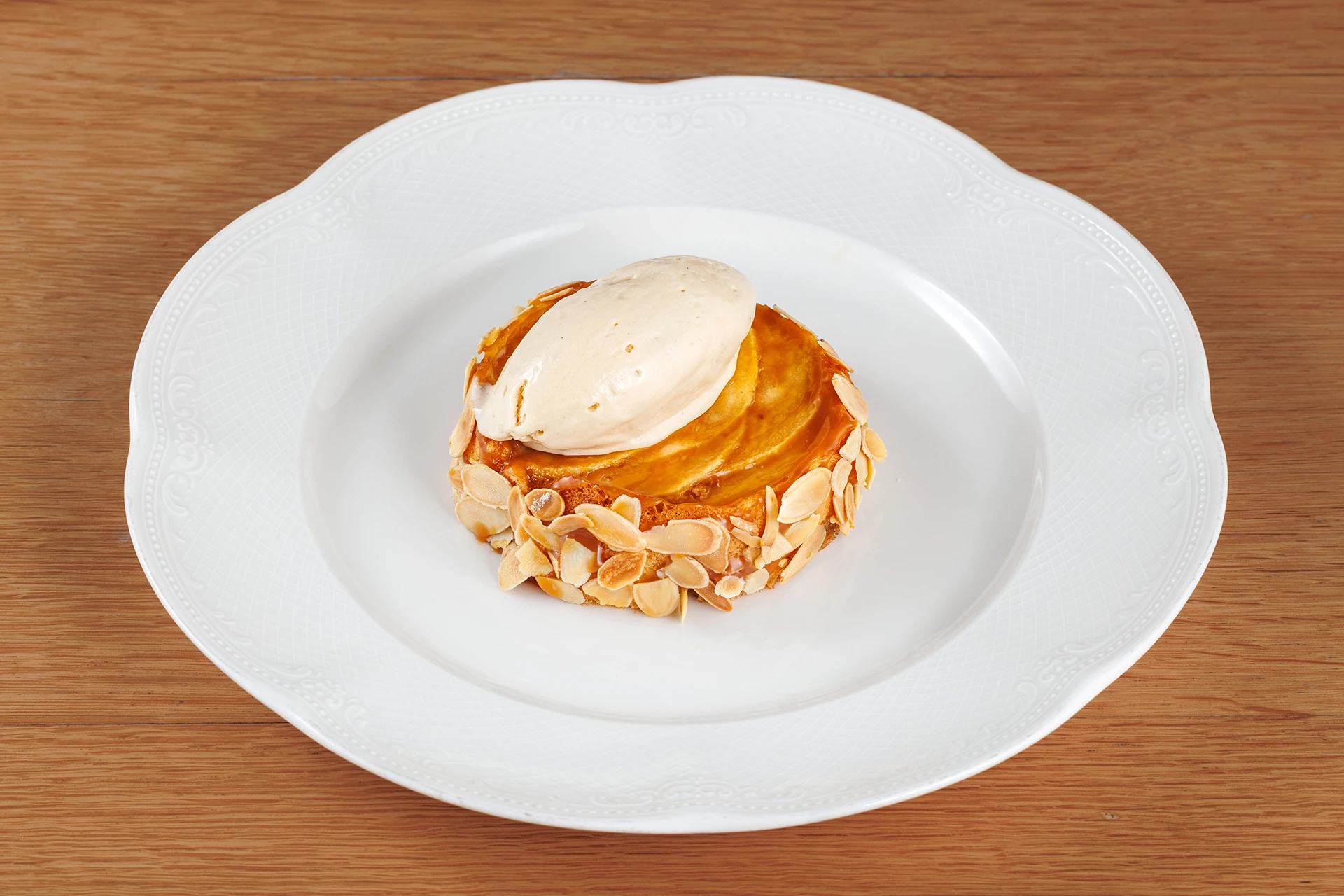 Шарлотка с карамелью, миндальными лепестками и мороженым из ряженки